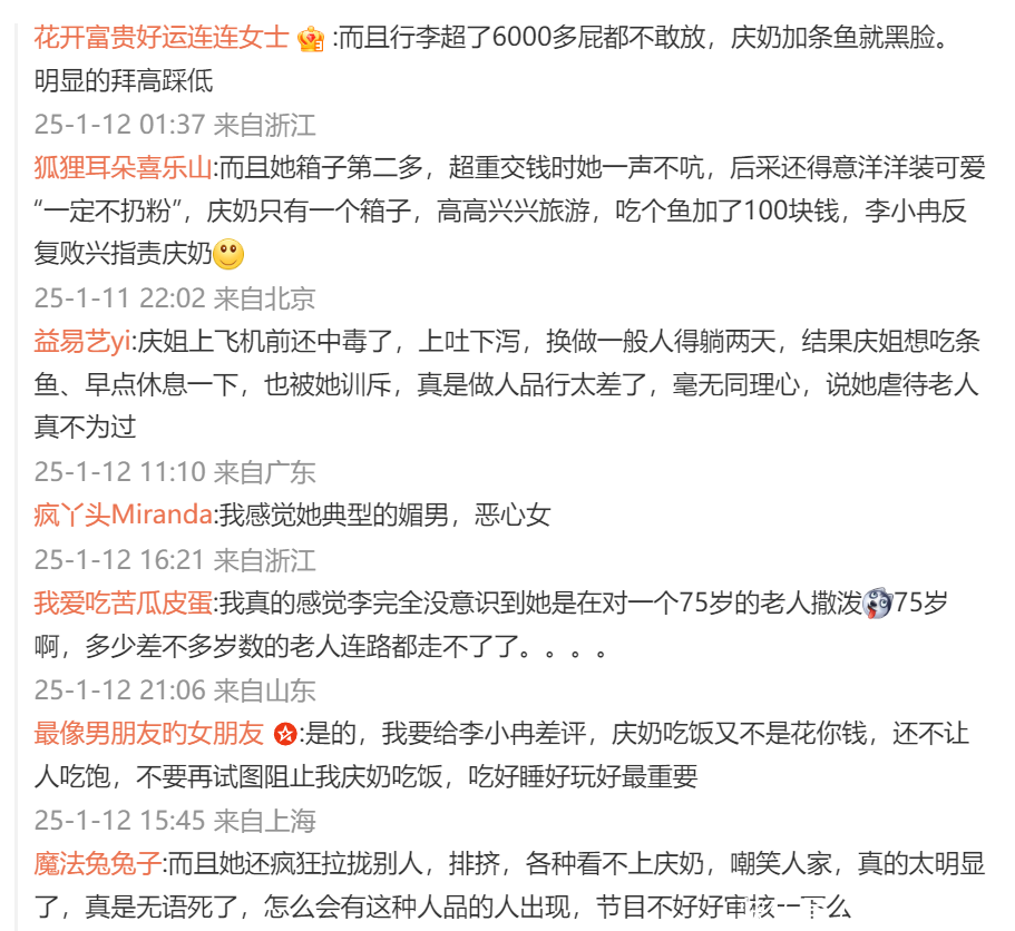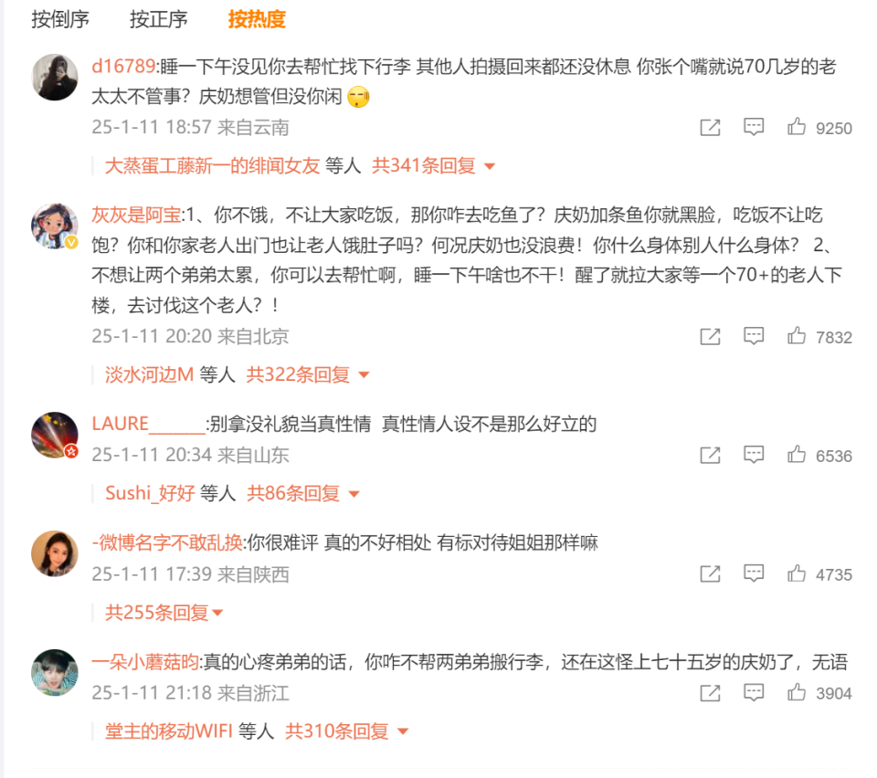 比如这条“睡一下午没见你去帮忙找下行李,其他人拍摄回来都还没休息,你张个嘴就说70几岁的老太太不管事?庆奶想管但没你闲。”这条评论下面有300多条回复,有网友表示同意“一下飞机自己不想吃饭就主张晚上再吃,没考虑其他姐姐们饿不饿,下午睡醒了一直在带着情绪嘴别人,气死了”、“负能量最多的人,对前辈不尊重,看人背景,别拿人品差当真性情”、“她这个已经不是情商低了,她真的就是人品就是这样的。”
