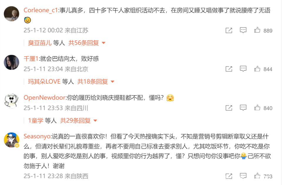 也有网友吐槽她事儿多“四十多下午人家组织活动不去,在房间里又睡又唱做事了就说腰疼了无语”,还有毒舌网友说的很直接“就会巴结向太,败好感”。还有路转黑的粉丝表示热搜确实下头“请对长辈们礼貌尊重些,再者不要用自己标准去要求别人,尤其吃饭环节,你吃不吃是你的事,别人爱吃多吃是别人的事,视频里你的行为越界了。”